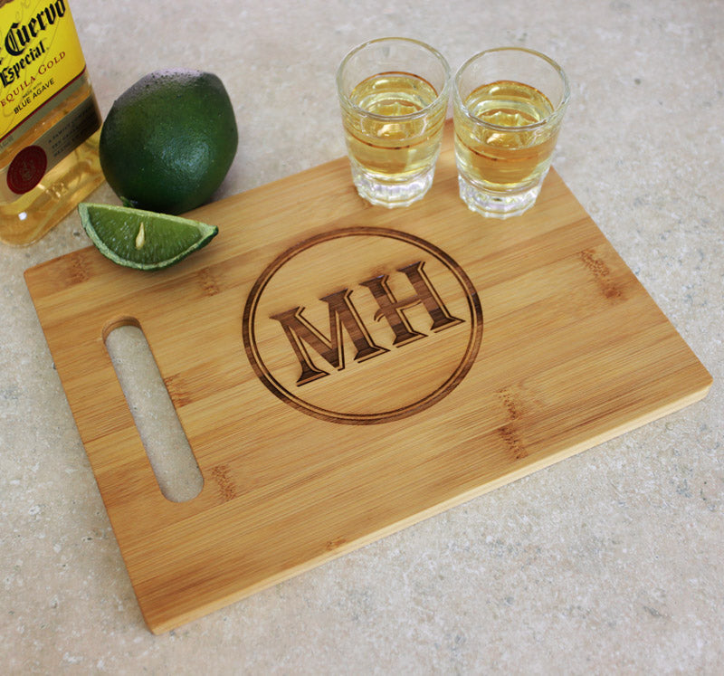 The Personalized Bamboo Cutting Board and Shot Glass Set is a great way to serve up shots in style! This handy set features a bamboo cutting board that can be personalized with any initials and 2 extremely durable BarConic® Shot Glasses. The board is made of Eco-friendly that is intended to last for years of use with proper care. It even has a handy cut out that you can use to hang it anywhere in your kitchen so it is always ready for use. This set makes a great gift for birthdays, holidays, house warming parties, and more!